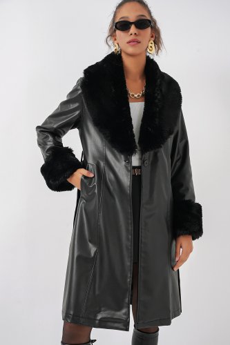 1026 Yaka Kürklü Kemerli Suni Deri Mont